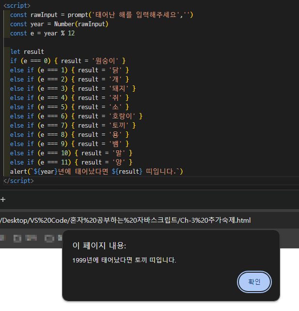 p. 152의 <태어난 연도를 입력받아 띠 출력하기> 예제 실행하여 본인의 띠 출력한 화면 캡처하기